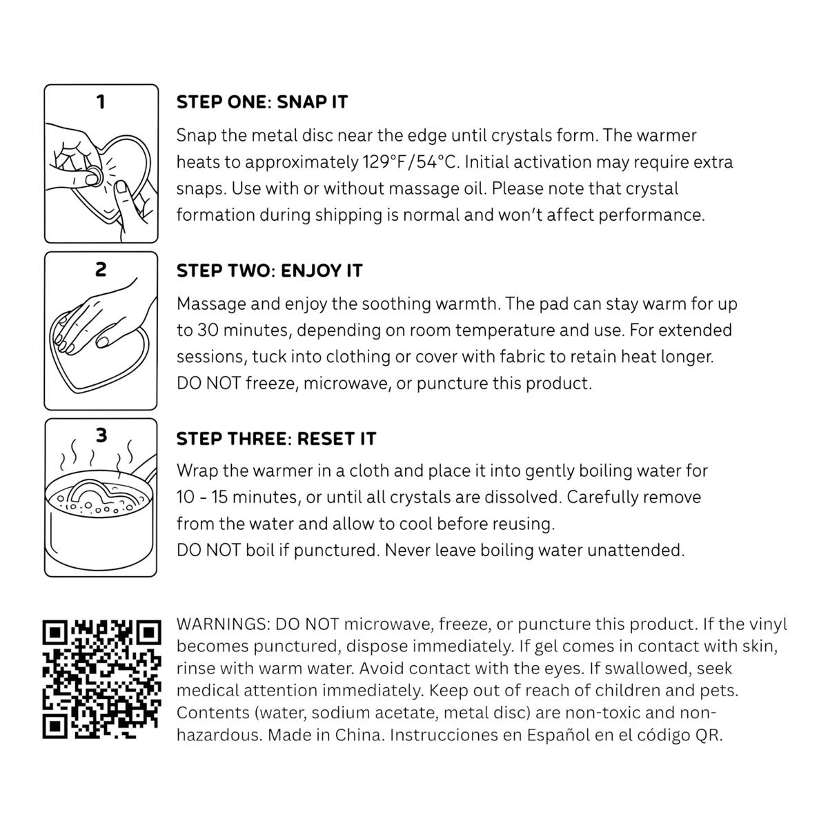 Turn up the heat whenever you need it with our reusable massager—a heart-shaped heat pack that’s ready in a snap. Just bend the metal disc inside to activate instant warmth that lasts up to 30 minutes*. It's perfect for soothing muscles, warming hands, or adding a touch of warmth to your foreplay. Once it cools, simply boil to reset and reuse over and over again.